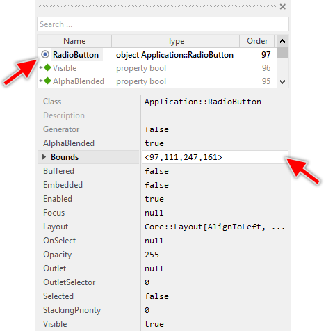 Once added to the component, you can freely move the Radio Button instance, or you simply grab one of its corners and resize it in this way. You can control the position and the size of the component also by directly modifying its property Bounds. If you want the Radio Button to appear behind other views you can reorder it explicitly.