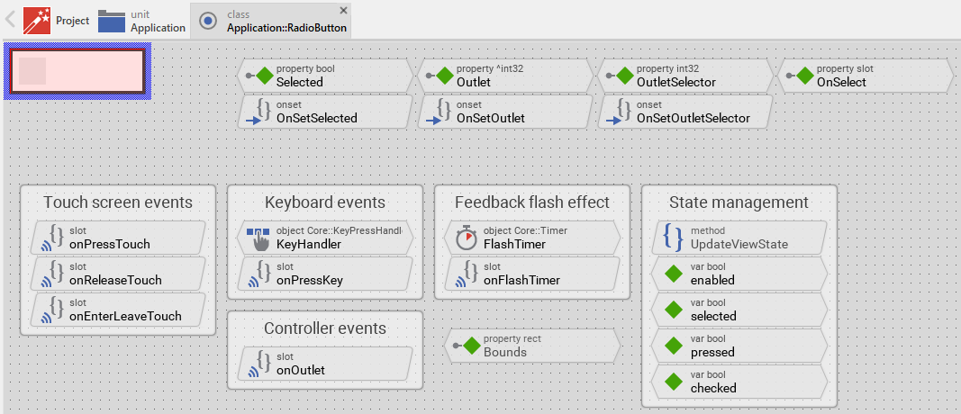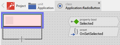 Usually, each particular setting within a component is represented by the corresponding property. Thus, a button where color and icon can be configured will require two properties: one for the color and one for the icon bitmap. In its original version, the Radio Button contains already four properties Selected, Outlet, OutletSelector and OnSelect. It allows the button instance to configure its actual state (On or Off) or to exchange data with the button. In order to enhance this interface by your own properties, following steps are necessary:
