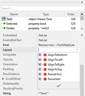 The property Outlet can refer to any other int32 property the widget should remain synchronized with. When the user selects the radio button, the affected property is automatically updated to the value found in the property OutletSelector. On the other hand, when the referred property is modified by another one, the button is automatically notified to remain in sync with the property. The button appears selected, when the referred property has the value equal to OutletSelector. This approach follows the model-view-controller (MVC) programming paradigm, where the Radio Button has the function of the view and controller and the property referred via Outlet serves as model. See also Outlet properties. |