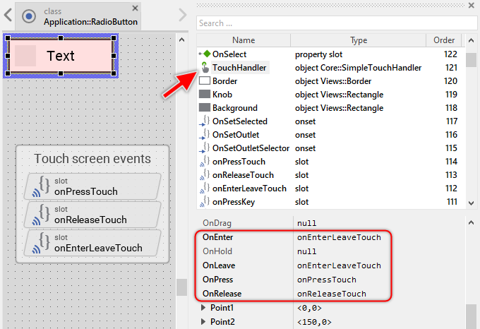 The Radio Button is an interactive component. It can be controlled via touch screen or by the mouse device. For this purpose the template contains the Simple Touch Handler object named TouchHandler. To this handler are associated three slot methods: onPressTouch, onReleaseTouch and onEnterLeaveTouch. As their names imply the methods are invoked at the beginning of the interaction (press), at its end (release) and repeatedly during the interaction if the user drags the finger (mouse pointer) out (leave) and in (enter) the handler's area: