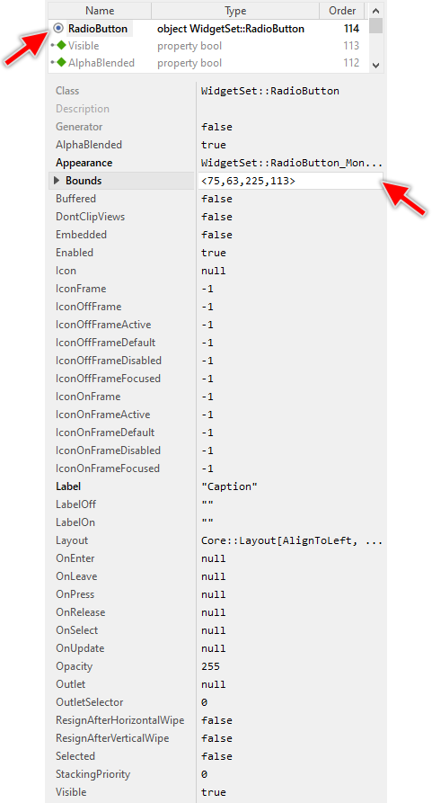 As long as the Radio Button widget is selected you can inspect and modify its properties conveniently in the Inspector window as demonstrated with the property Bounds in the screenshot below: