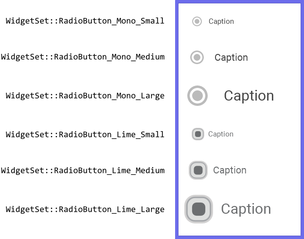 The appearance and partially also the behavior of the Radio Button widget can be configured according to your particular design expectation. For demonstration purpose and to help you to quickly create new product prototypes, Embedded Wizard contains six ready to use configurations. The configurations are provided in two different designs we named Mono and Lime. In each design there are three different sizes Small, Medium and Large. The following figure demonstrates all available default configurations at once: