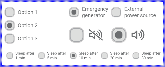 The Radio Button is a bistable widget. When the user taps within the button's area or, if the button is actually focused, presses the key on the keyboard to activate it, the button may toggle between its Off and On states. Later, when the user activates another button belonging to the same group of mutually exclusive options, the button returns to its Off state again. These alternations are reflected in the button's property Selected.