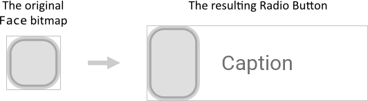 The appearance of the Radio Button is limited to the visual elements that compose it. To overcome this limitation you can enrich the Radio Button by additional decoration views. The section Combine the Radio Button with decoration views explains how to do this in context of a GUI component containing the Radio Button. That means, the Radio Button and the additional decoration views are siblings in context of the superior GUI component. The code necessary to update the appearance of the decoration views is implemented directly within the GUI component.