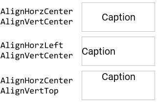 The property LabelAlignment is declared as Views::TextAlignment, a set data type, which means that you can activate and deactivate the various alignment options individually. For example, deactivating the option AlignHorzCenter and activating the option AlignHorzLeft will result in the label text being aligned at the left edge of the Label view. The following figure demonstrates few examples of how the initialization of the property LabelAlignment affects the Radio Button (the gray borders indicate the areas of the Label views):