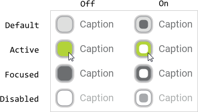 In case of alpha-only bitmaps the properties determine the colors to tint the bitmaps. You have to specify the colors individually for every possible button state. Accordingly, depending on its actual state, the button can display the icon bitmap with different colors. For example, you can configure the properties so that when the user presses the Radio Button (button is in the Active state), the icon appears with a brighter color and when the button is disabled, the icon appears faded. The following figure demonstrates it: