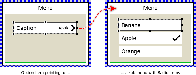 Please note, the Option Item components are used in superior menus to refer a sub menu containing Radio Items. In such case the Option Items displays which Radio Item in the corresponding sub menu is actually selected. When the user activates the Option Item, the sub menu is presented and the user can now select other Radio Item.