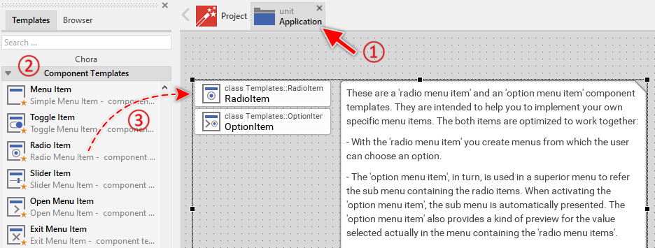 The approach with component templates has two functions. Primarily the templates should simplify the development of new components. Instead of creating the Radio Item from scratch you can use the available template. The second function is more educative. The template implements fully working Radio Item component you can investigate and learn about the corresponding programming aspects. The template is well documented. It contains annotations and inline comments with instructions helping you to understand how the component works and how it can be adapted to your particular needs.