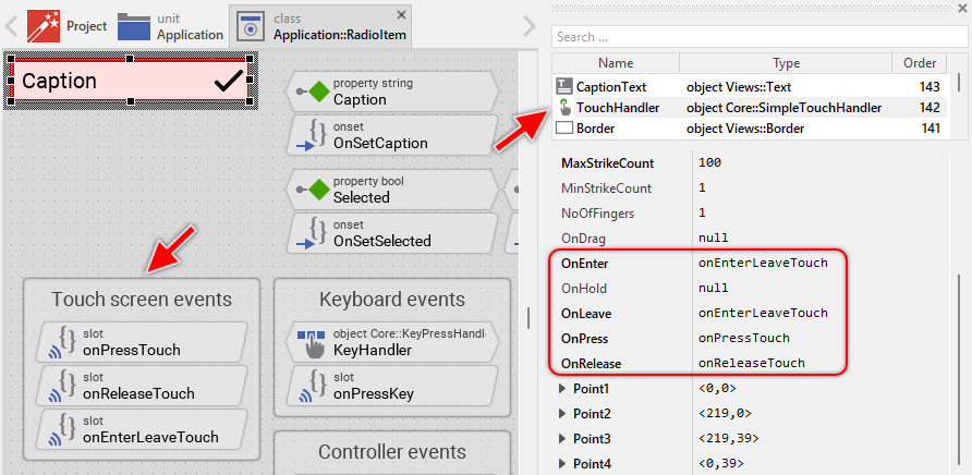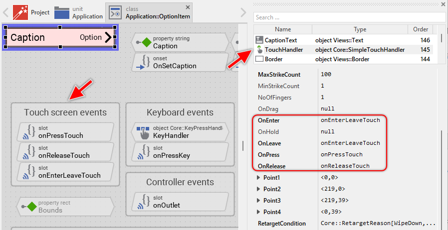 The Option Item is an interactive component. It can be controlled via touch screen or by the mouse device. For this purpose the template contains the Simple Touch Handler object named TouchHandler. Per default, this handler covers the entire area of the item - this is thus the touch sensitive area. To this handler are associated three slot methods: onPressTouch, onReleaseTouch and onEnterLeaveTouch. As their names imply the methods are invoked at the beginning of the interaction (press), at its end (release) and when the user drags the finger and enters or leaves the item's area: