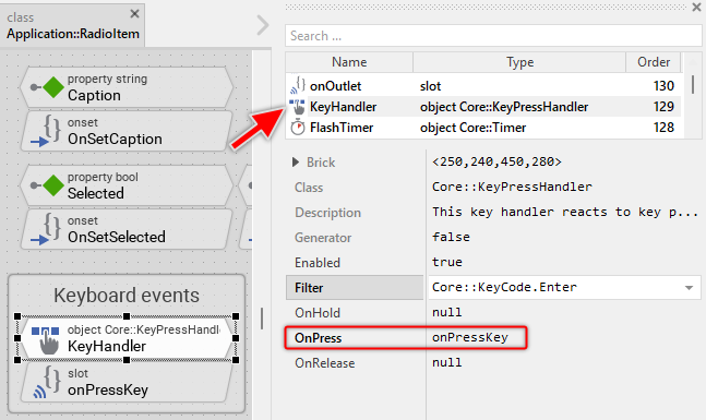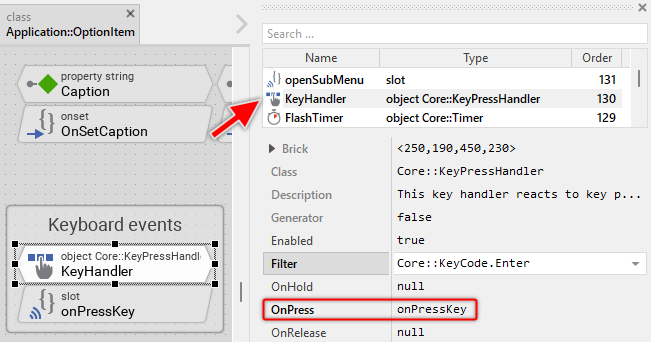 The Option Item is an interactive component. It can be controlled via keyboard or hardware buttons. For this purpose the template contains the Key Press Handler object named KeyHandler. To this handler is associated the slot methodonPressKey. The method is thus invoked when the user presses the key matching the filter condition specified in the handler object. This is per default the Enter key: