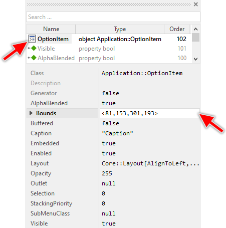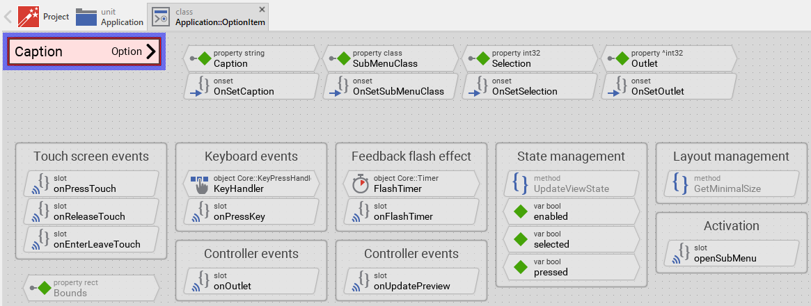Usually, each particular setting within a component is represented by the corresponding property. Thus, an option item where icon, caption, sub menu class and current selection can be configured will require four properties. In its original version, the Option Item contains already four properties Caption, SubMenuClass, Selection and Outlet. The first stores the text to display, the second determines which menu component to create and present when the user activates the menu item, the third stores a value representing the current selection, and the fourth can refer to any other int32 property the item should remain synchronized with. In order to enhance this interface by your own properties, following steps are necessary: