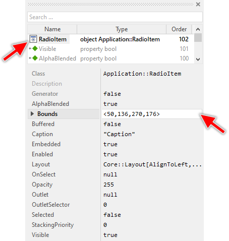 As long as the Radio Item is selected you can inspect and modify its properties conveniently in the Inspector window as demonstrated with the property Bounds in the screenshot below. This is in so far worth mentioning as diverse features of the Radio Item are controlled by the corresponding properties. If you are not familiar with the concept of a property and the usage of Inspector window, please read first the preceding chapter Compositing component appearance.