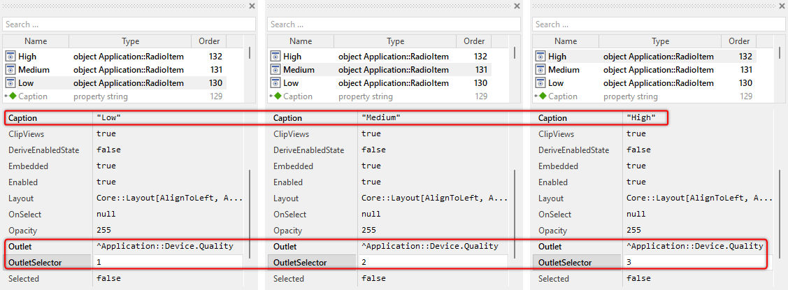 The following example demonstrates how to configure three Radio Items for quality selection. The items are connected to a common property Application::Device.Quality. Consequently, the selection in all Radio Items remains in sync with the property value: