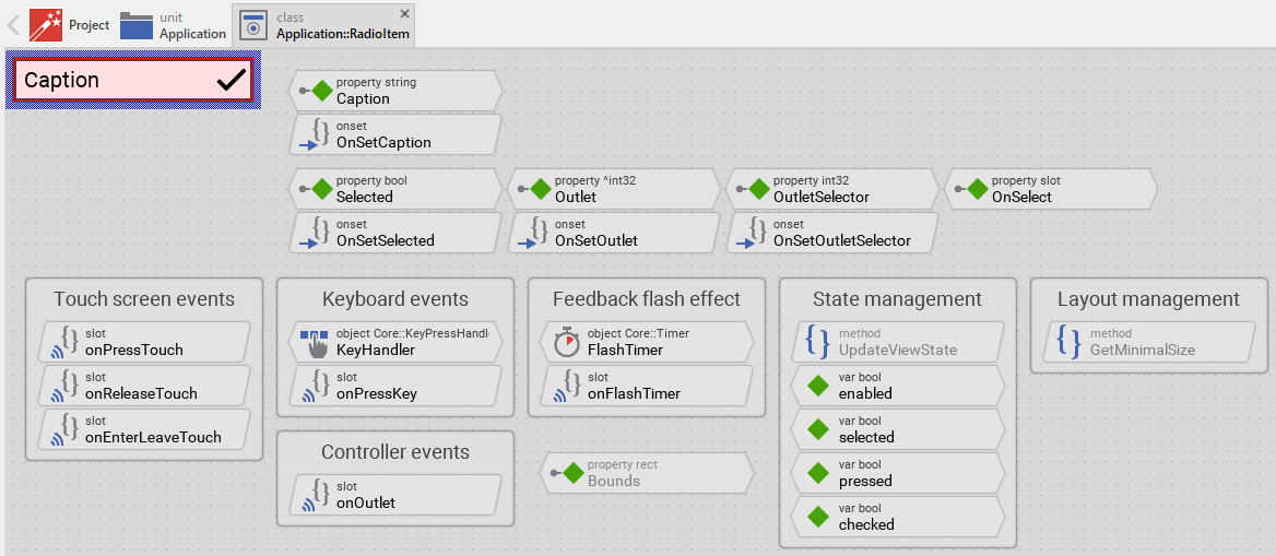 Once you have created the Radio Item component, you can use it to assemble menu components. Technically seen, you embed an instance of the Radio Item class in-place within a superior Menu GUI component. At the runtime, the superior Menu GUI component takes care of the correct initialization, arrangement and the displaying of all embedded item components.