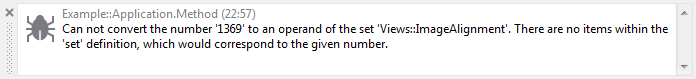 The integer to set conversion operator converts the given unsigned integer value in an operand of the specified set data type. In practice, this conversion evaluates the enumerators existing within the set and looks for those whose associated values do match the given integer value. During prototyping this operation is strictly supervised in order to avoid that numbers not having an enumerator counterpart within the set do pass the conversion. If such case is detected, a runtime error is reported: