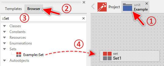 Set members have a global character - they can be accessed from everywhere within your project. To address a set member, you must always use its full name, which is composed of the unit name, the member is defined inside, and the name of the member itself, both separated by :: (double colon) signs. For example Views::TextAlignment.