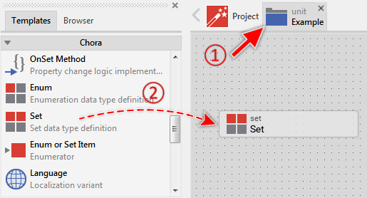 This section describes the Chora syntax of how sets are stored inside Embedded Wizard project files. The knowledge about the syntax can be helpful when you plan to process the project contents by third party tools. In particular, the general purpose Export and Import functionality introduced in version 14 requires a good understanding of how project members are represented in Chora syntax to correctly interpret the exported members and synthesize the Chora code for members to import. Please note, Embedded Wizard project files (and thus Chora code) are encoded as text in UTF-8 format.