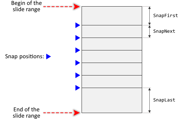 If your application case it requires, with the properties SnapFirst and SnapLast you can configure different values for the first and the last snap position. Accordingly, the Slide Touch Handle will snap first after a distance determined by SnapFirst, then after every further distance determined by SnapNext. The last snap position lies SnapLast far away from the end of the slide range. The following figure demonstrates the effect of those three properties: