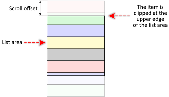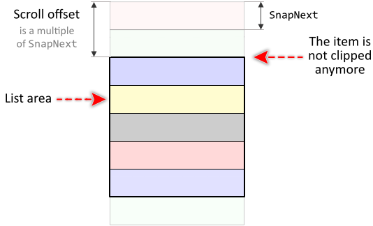 With the above described example of a Slide Touch Handler used to scroll the items within a Vertical List, you can configure the property SnapNext with a value corresponding to the height of a single list item. Later when the user scrolls the list, the Slide Touch Handler will stop at the borders lying between two items. The first visible item is not clipped anymore: