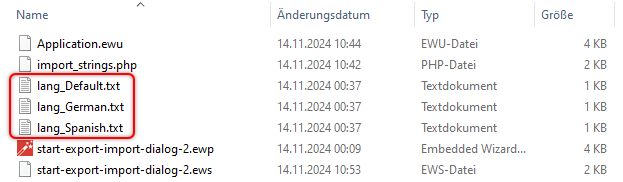 Once the tool is finished you will find following three files in the project folder. These files contain the exported string constants mentioned in step 4 and divided according to their language variants. The files could now be sent to a translation office, etc. for further processing: