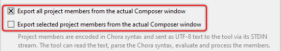 To perform an export operation of project contents, you have to enable one of the following check boxes. The first check box exists for your convenience and has the effect of all members in the actual Composer being provided for the export operation. The second box is more selective, when using it, you can determine the exported members individually. For this purpose select the desired members in Composer beforehand. Non selected members are not exported in that case: