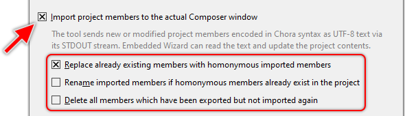 In the similar manner, the tool can provide Embedded Wizard with project contents intended for the import. Again, the contents are encoded as text in Chora syntax. Embedded Wizard can evaluate the contents and integrate them into the project structure. Depending on the configuration of the import operation, new imported contents can replace existing contents or can be just appended to the project. This allows incremental imports and re-imports (updates of already made imports).