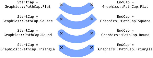 The Stroked Path Bitmap supports four different modes how to raster the start and the end cap of an opened path. You select the desired modes by initializing the properties StartCap and EndCap with appropriate values. In this manner you can configure the start and end caps individually. The following table provides an overview of the possible values: