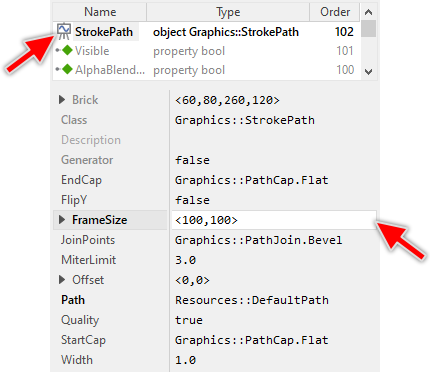 As long as the Stroked Path Bitmap object is selected you can inspect and modify its properties conveniently in the Inspector window as demonstrated with the property FrameSize in the screenshot below: