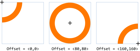 Let's assume, the associated path object describes a circle with its center lying at the origin of the path own coordinate system (0,0). Depending on how the property Offset is configured, the circle appears at different positions within the Stroked Path Bitmap as demonstrated in the following screenshot. For visualization purpose, the black cross indicates the center of the path coordinate system and the thin blue frames are borders of the respective Stroked Path Bitmaps. Please note, parts of a shape lying outside of the bitmap's area are clipped and not visible: