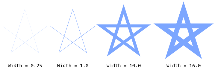 To specify the thickness of the stroked path you simply use the property Width. It accepts floating-point values permitting you to change the width with sub-pixel precision. For example, to rasterize a path with 10.75 pixel thickness, you assign the value 10.75 to this property. The following figure demonstrates the effect: