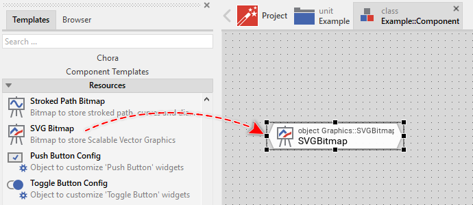 The content to rasterize within an SVG Bitmap is determined by its property SVG. Usually, you initialize this property with the name of an existing SVG resource member, which is typical for all immutable contents like button icons, screen backgrounds and any other decorations well known already at the design time. With the Inspector Assistant you can conveniently select the right resource when you edit the initialization expression for the property SVG.