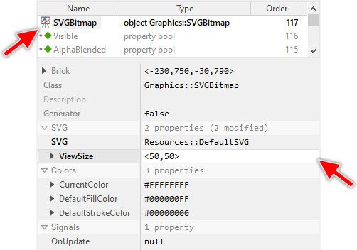 As long as the SVG Bitmap object is selected you can inspect and modify its properties conveniently in the Inspector window as demonstrated with the property ViewSize in the screenshot below. Please note, for better overview the below screenshot has been made with Inspector window being configured to sort the properties by categories: