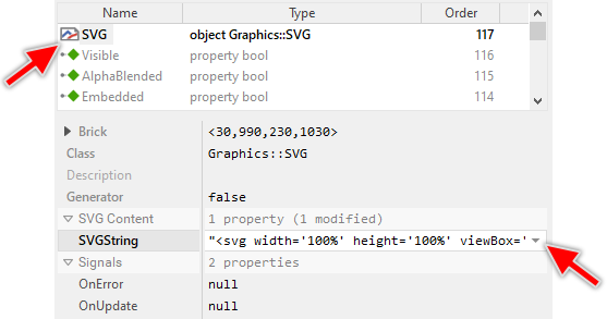 As long as the SVG Data object is selected you can inspect and modify its properties conveniently in the Inspector window as demonstrated with the property SVGString in the screenshot below. Please note, for better overview the below screenshot has been made with Inspector window being configured to sort the properties by categories: