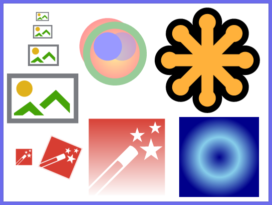 Diverse SVG images displayed in Embedded Wizard. The orange icon in the upper-right corner is a variant of the official logo for SVG (Scalable Vector Graphics) file format standard and is subject to W3C Document license conditions.