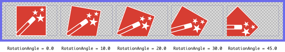 With the property RotationAngle you can determine the rotation of the displayed SVG image as angle in degrees. The rotation is performed clockwise around the position specified in the properties RotationCenterX and RotationCenterY relative to the top-left corner of the SVG image. Per default, the RotationCenterX and RotationCenterY are 0.0 which has the effect of the SVG image being rotated around its own top-left corner as demonstrated in the following figure (the gray borders indicate the view areas):