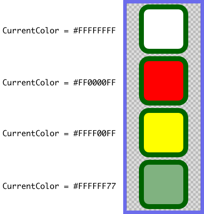 To specify a concrete color value for all occurrences of currentColor, the SVG view provides the property CurrentColor. The following figure demonstrates the effect of this property with SVG views displaying the SVG image from the above code snippet. Even if all four SVG view instances share the same SVG image, each instance uses a different color to paint the inner rectangle. In the fourth case, the color is semitransparent white (#FFFFFF77) resulting in the outer green rectangle shining through the inner rectangle: