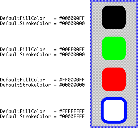 Additional possibility to configure color values at the runtime of an application is available through the properties DefaultFillColor and DefaultStrokeColor. In fact the possibility to configure colors using the both properties goes beyond the SVG specification. According to the specification, fill operation without explicitly specified color (the SVG fill attribute is omitted) are using black color. Stroke operations, in turn, are transparent if the SVG image is missing the appropriate stroke attribute.