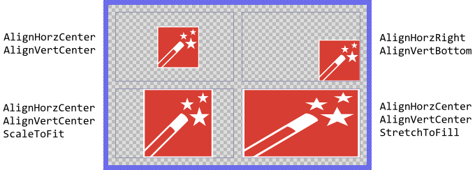 If desired, with the property Alignment you can determine other behavior how the SVG view should react when its size and the size of the displayed SVG image are different. In particular, you can align the image at the edges of the SVG view or you can instruct the view to proportionally scale or even stretch the SVG image so it fits within the available area. The following figure demonstrates few examples of how the initialization of the property Alignment affects the image layout (the gray borders indicate the view areas):