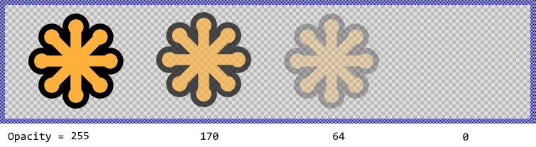 Using the property Opacity you can modulate the original opacity of the displayed SVG image, so that it appears semi-transparent even if the original content was opaque. The valid values for the property Opacity are 0 .. 255, whereby the smaller the value the more transparent the resulting image. For example: