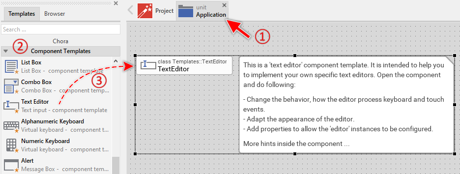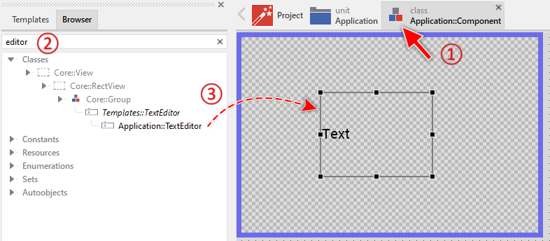 To create a new Text Editor component from a template you simply Drag & Drop it between the Templates window and the Composer with an opened unit. This is important in that by using the component templates you add in fact a new class to your project. Classes, in turn, can exist within units only. The following are the typical steps to create a new Text Editor component from a template: