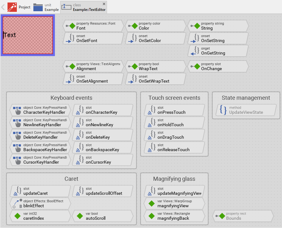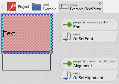 Component templates are intended to create widgets which can be adapted and enhanced to your particular design expectations. For this purpose, once you have added a new Text Editor component to your project, you can open the component class for editing. Thereupon the implementation of the component appears in a new Composer page: