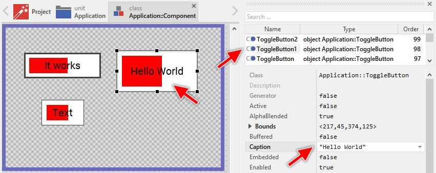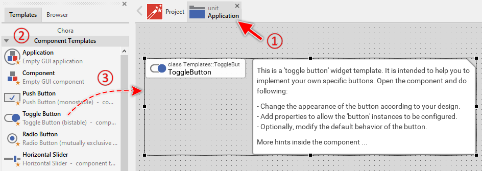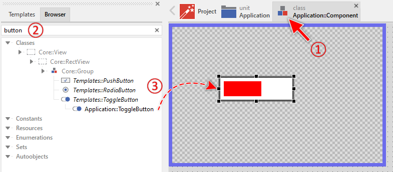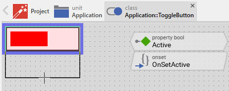 To create a new Toggle Button component from a template you simply Drag & Drop it between the Templates window and the Composer with an opened unit. This is important in that by using the component templates you add in fact a new class to your project. Classes, in turn, can exist within units only. The following are the typical steps to create a new Toggle Button component from a template: