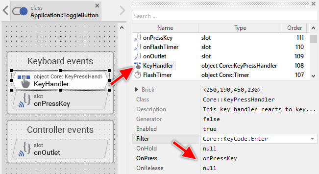 The Toggle Button is an interactive component. It can be controlled via keyboard or hardware buttons. For this purpose the template contains the Key Press Handler object named KeyHandler. To this handler is associated the slot method: onPressKey. This method is invoked when the user presses a key matching the filter condition specified in the KeyHandler object. This is per default the key Enter:
