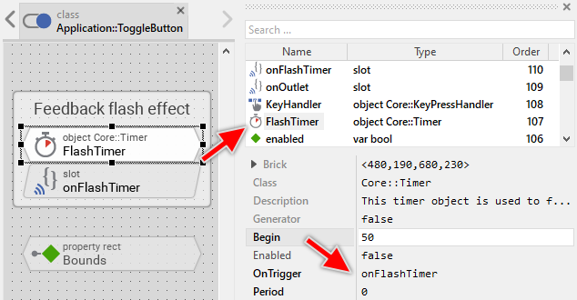 When the user touches the button or presses the associated key, the button changes its visual appearance to provide to the user a kind of feedback that the user successfully hit it. If the user taps the button very quickly, however, the time elapsed between the press and release events is possibly too short to highlight the button sufficiently and so provide the desired feedback. In such case the implementation responsible for handling touch and keyboard events triggers the timer object named FlashTimer. The timer prolongates thereupon the visual effect. As soon as the timer expires, it signals its associated slot method: onFlashTimer: