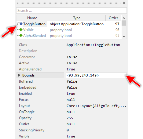 Once added to the component, you can freely move the Toggle Button instance, or you simply grab one of its corners and resize it in this way. You can control the position and the size of the component also by directly modifying its property Bounds. If you want the Toggle Button to appear behind other views you can reorder it explicitly.