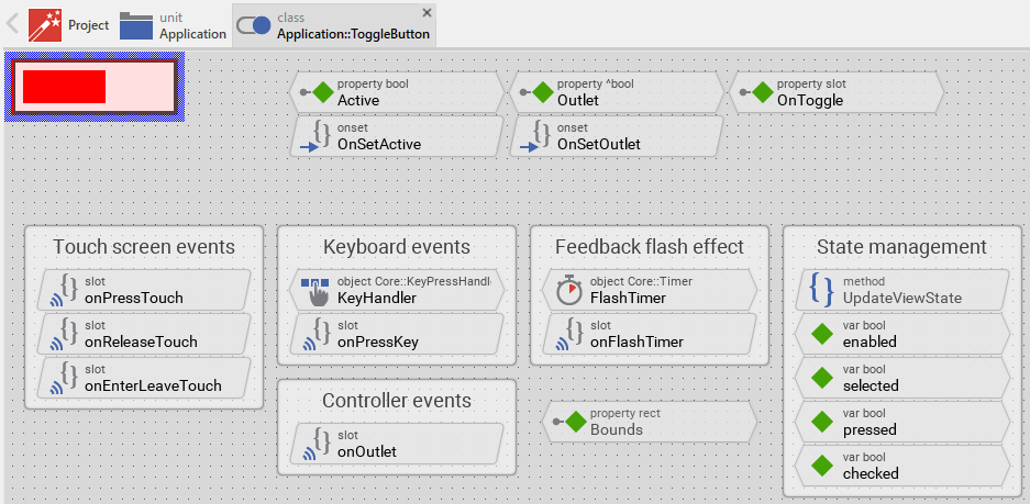 The connection between the Toggle Button and the data provider is established by assigning to the Toggle Button's property Outlet a reference to a property existing within the data provider and storing the interesting value. Since Toggle Button is a bistable widget (it can assume only the states Off or On), the property suitable to be connected via reference to the button has to be declared with bool as its data type. Accordingly, the value false of the property corresponds to the state Off of the button and the value true to the state On.