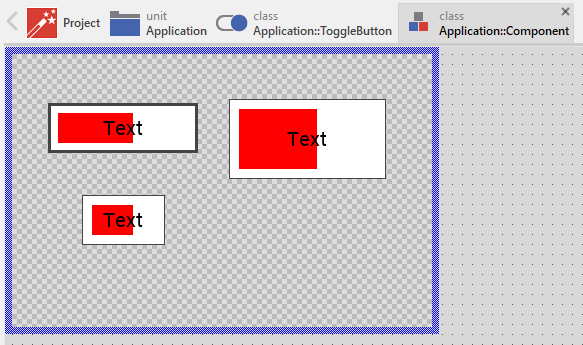Once you have created the Toggle Button component, you can use it to assemble more complex components. Technically seen, you embed an instance of the Toggle Button class in-place within some superior GUI component. At the runtime, the superior GUI component takes care of the correct initialization and the displaying of all embedded components, so they appear similarly as you have composed them at the design time.