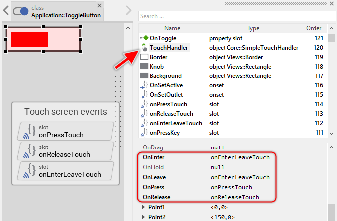 The Toggle Button is an interactive component. It can be controlled via touch screen or by the mouse device. For this purpose the template contains the Simple Touch Handler object named TouchHandler. To this handler are associated three slot methods: onPressTouch, onReleaseTouch and onEnterLeaveTouch. As their names imply the methods are invoked at the beginning of the interaction (press), at its end (release) and repeatedly during the interaction if the user drags the finger (mouse pointer) out (leave) and in (enter) the handler's area: