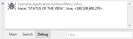 The trace statement expects one or more expressions that are evaluated when the statement is executed. The results of these expressions are converted in text and output to the Log window or to debugging console in the target system. The trace statement is an useful tool when you are evaluating or debugging the application. For example: