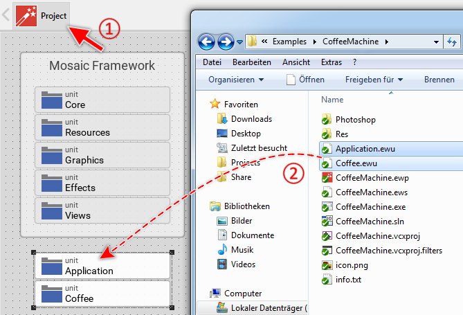 Alternatively you can add existing units by conveniently drag-and-drop the original unit files (*.EWU) directly from the MS-Windows file explorer into a Composer containing the project main page. Accordingly, Embedded Wizard adds for every unit file a new unit member automatically. The unit members are already configured to refer to the location where the original unit files are found, so you don't need to specify the unit directory manually. To add new unit members by drag-and-drop do following: